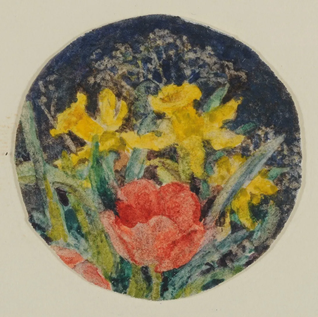 This week we are inspired by the arrival of spring and the big, bright flowers opening in gardens and on trees all over London. Local artist Kate Taylor Cumming painted flowers and portraits all her life. The one shown here is only 3.2 cm or about the length of your longest finger! Look closely at all the detail she is able to add in this tiny picture: the flower petals, leaves, and blue sky. How many flowers can you find? She makes the picture look real by painting the red tulip larger than the yellow daffodils so it feels like it is closer to us. Why do you think she put the flowers in a circle? It is like looking into a little droplet of water. Next time you find flowers in bloom make a circle with your thumb and finger to focus through, and draw what you see.