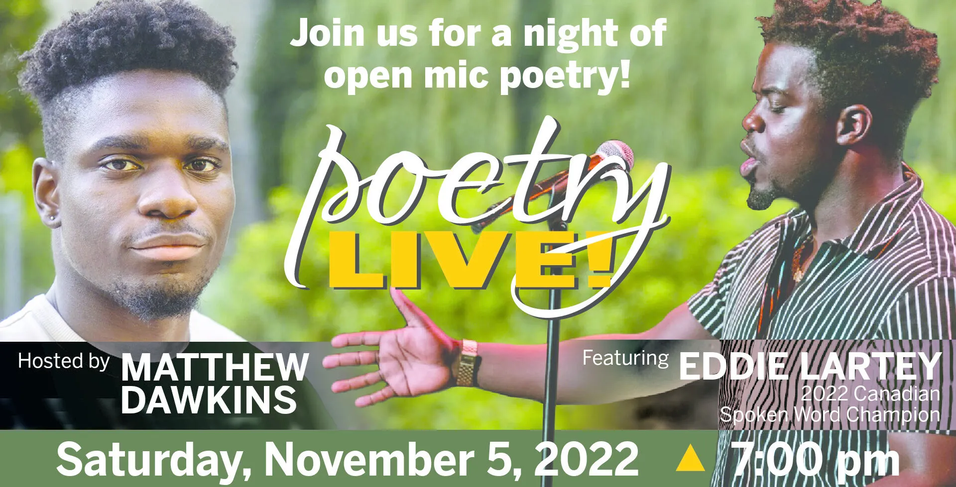 Are you a poetry aficionado in London? Join us for Poetry Live!, an evening of open mic poetry at WordsFest London Canada, hosted by Matthew Dawkins and featuring 2022 Canadian Poetry Slam Champion Eddie Lartey! We are very pleased to return to our venue at Museum London!