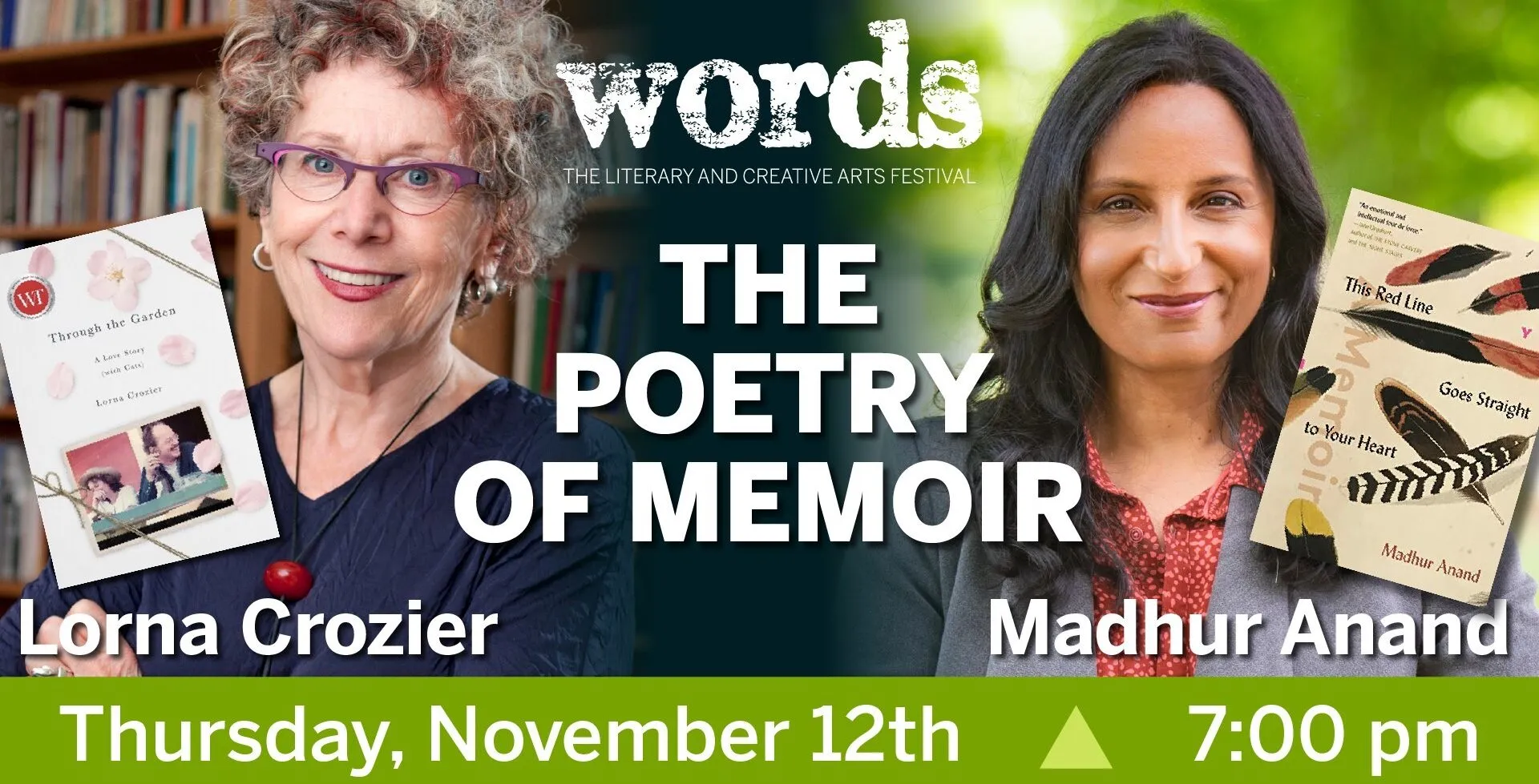 The Words Festival is pleased to “The Poetry of Memoir,” featuring Lorna Crozier & Madhur Anand. Our host for the event will be Vidya Natarajan.