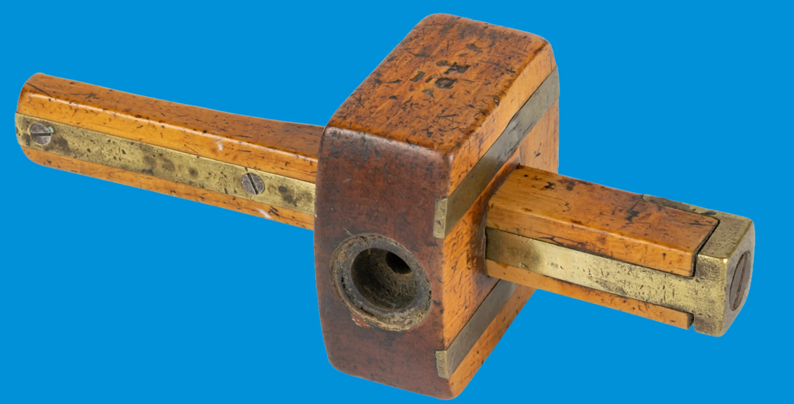 A historical moulding plane is seen on a vibrant blue background. The plan is made of wood and metal and shows signs of use over time.