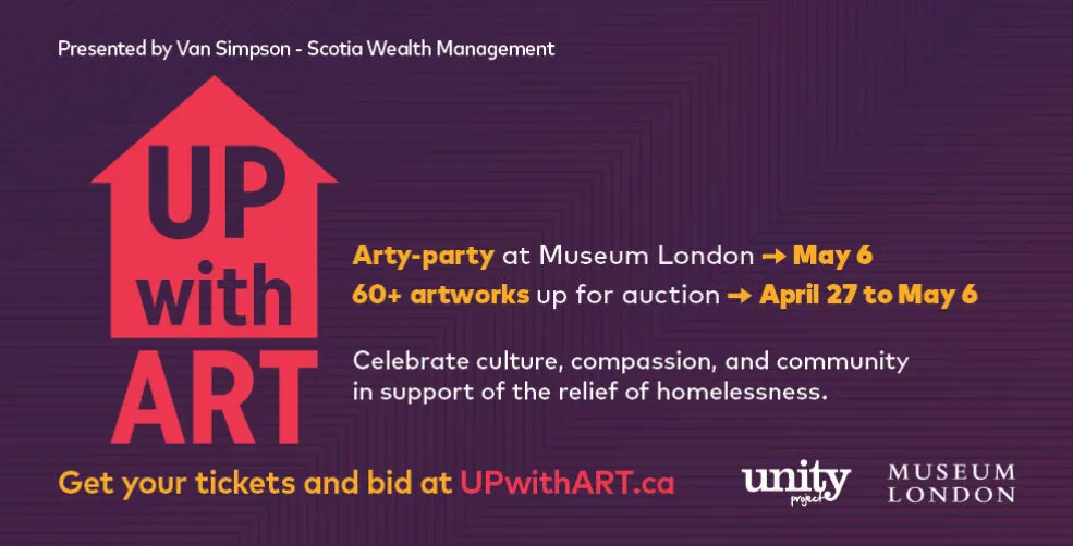 London’s best arty-party silent art auction fundraiser is back as a hybrid event celebrating culture, compassion and community in support of Unity Project for Relief of Homelessness and Museum London! Online bidding begins on 60+ artworks begins Thursday, April 27 at 7pm EST